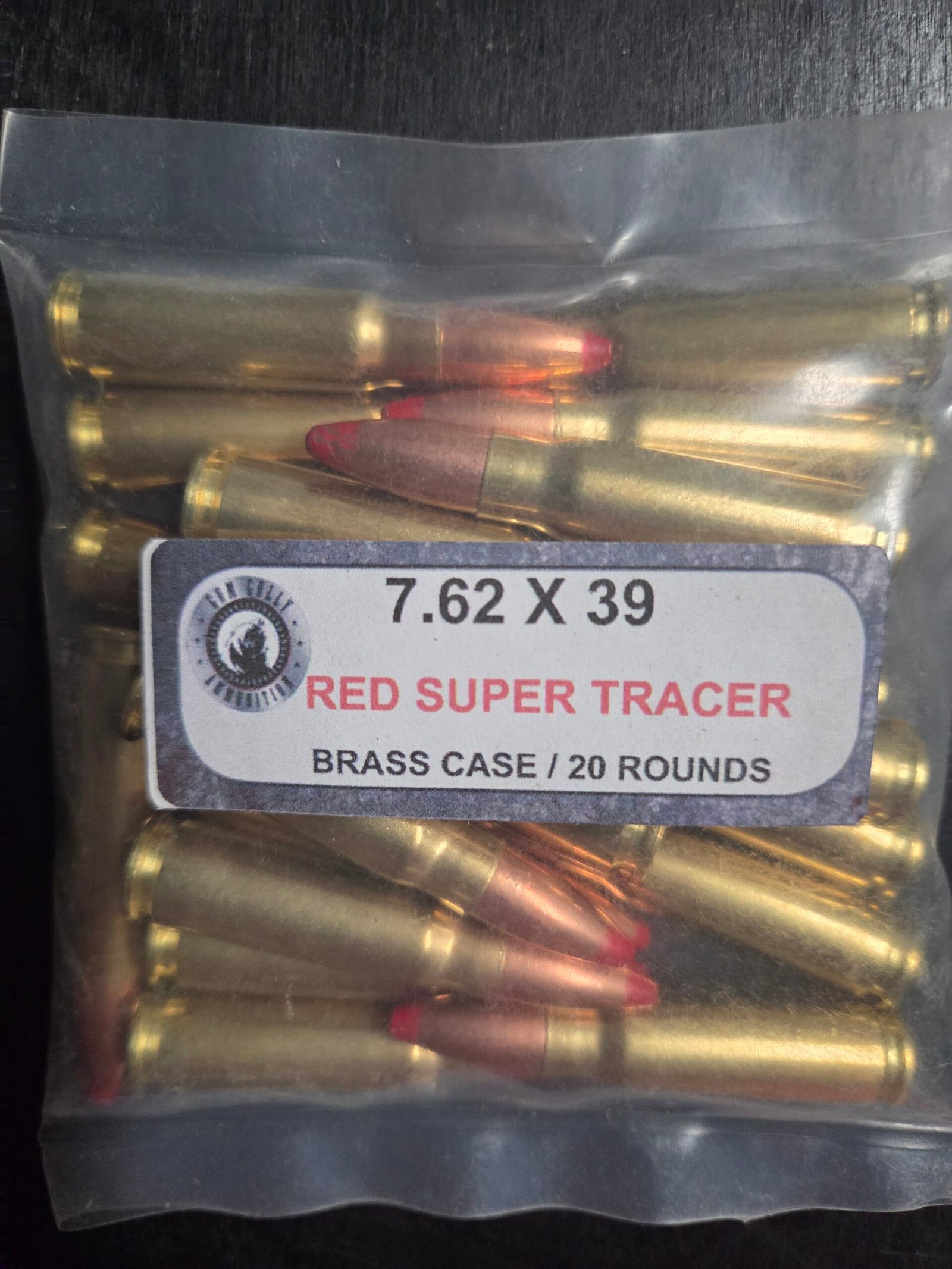 The 7.62 x 39 Gum Gully Super Tracer Ammunition is a much brighter Tracer round than standard tracer. It ignites 75 yards out of the muzzle and traces with a Very Bright Day Light Trace. It is available in Red, Green, Yellow and White. It will trace 600 yards. It will not harm your barrel. These rounds are loaded in brass cases. 20 round pack.